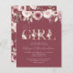 Este doce convite para chás de fraldas apresenta uma borda superior de flores de cor-de-água cor-de-rosa e borrão. Abaixo, as palavras "é uma menina" aparecem, com a palavra "menina" em letras douradas enfeitiçadas com buquês arrojados e embaçados. Personalize o texto com o nome da futura mãe no elegante roteiro de escrita manual rosa-pincel e os detalhes em letra de sans serif branca em fundo branco. Um padrão floral de burgundy e blush, que coordena, decora a parte de trás do cartão.