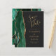 A borda esquerda deste elegante casamento moderno salve o cartão de data apresenta uma esmeralda verde aquarela agate borda com falsa brilho dourado. O texto personalizável combina manuscrito dourado, fontes em copperplate e itálico em um fundo preto de slate. O verso apresenta um design emerald verde e dourado.