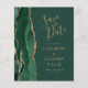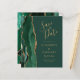 A borda esquerda deste elegante casamento moderno salve o cartão de data apresenta uma esmeralda verde aquarela agate borda com falsa brilho dourado. O texto personalizável combina manuscrito dourado, fontes em copperplate e itálico em um plano de fundo verde. O verso apresenta um design emerald verde e dourado.
