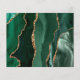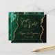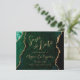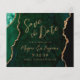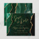 Este elegante cartão de salva datas de casamento apresenta uma imagem de fundo de ágata em aquarela verde esmeralda aparada com brilho falso dourado. O texto personalizável combina escrita moderna dourada, fontes copperplate e itálico. O verso apresenta um design coordenado de ágata verde esmeralda e dourado. NOTA: Os envelopes não estão incluídos automaticamente com esses convites econômicos, então lembre-se de escolher a opção "envelopes brancos em branco"!