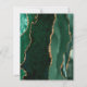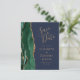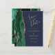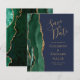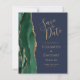 A borda esquerda deste elegante cartão moderno de save the date de casamento apresenta uma borda de ágata em aquarela esmeralda verde aparada com brilho de ouro falso. O texto personalizável combina caligrafia dourada, fontes copperplate e itálico em um fundo azul-marinho. O verso apresenta um design correspondente de esmeralda verde e ágata dourada.