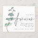 Uma alternativa de orçamento com bom custo-benefício em um tamanho menor de 4,5 x 5,6” semi-brilho 110lbs de peso, que tem uma espessura semelhante à de um cartão postal (no entanto, não é adequado para uso como cartão postal). POR FAVOR, OBSERVE que há UM convite por folha. Eucalipto Nós decidimos para Sempre Casamento Salve a Data. Um conjunto de tipografia elegante em preto para a palavra Forever complementando o resto do texto que você pode facilmente personalizar, com folhas de eucalipto aquarela à esquerda. No verso, um verde coordenador.