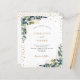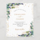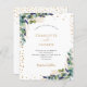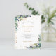 Um fundo branco decorado com verde de eucalipto, folhagem de ouro e corações. Personalize e adicione seus nomes e detalhes do casamento. Letras pretas e ouros coloridas. Fundo: fundo branco com corações dourados falsos borrifados.
