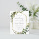 Este elegante convite de casamento rústico apresenta uma estrutura geométrica de folha falsa de ouro decorada com eucalipto e verde de azeitona. A palavra "casamento" aparece em escrita caligráfica. Personalize o texto da cinza de carvão com os nomes da noiva e do noivo e os detalhes do casamento na frente, e suas iniciais e URL do site no verso.