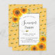 Um fundo amarelo decorado com girassóis de cor aquática rústica e um sorriso feliz de abelhas para sua festa de verão no quintal. Personalize e adicione os detalhes da sua festa, informações.