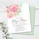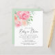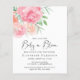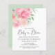 Este convite para chás de fraldas, bonito e amigável, apresenta flores cor-de-água rosa e coral e "Baby in Bloom" escrito em um roteiro de na moda contemporâneo.