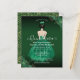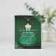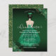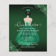 Este elegante convite Quinceañera apresenta uma garota em um vestido verde esmeralda com sotaques florais verdes e dourados. A parte traseira apresenta padrões de rosa dourado e verde. Fácil de personalizar clicando em "Personalizar".