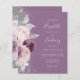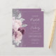 A borda esquerda deste convite de casamento moderno e elegante apresenta um buquê floral em tons de malva e rosa empoeirado, aparado com folha de prata falsa e folhagem de brilho falsa e polvilhado com brilho falso prateado. O texto personalizável combina escrita à mão em cinza prateado claro, fontes copperplate e itálico em um fundo malva. O verso apresenta um design floral correspondente em malva e prata.