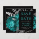 Este elegante e melancólico casamento Salve o cartão da data apresenta um buquê floral romântico e luxuoso em azul verde com folha de cor prateada e folhagem brilhante num fundo preto. Personalize a cinza prateada e o texto nominal em fontes na moda num retângulo preto. Adicione detalhes adicionais na parte de trás e insira o URL do seu site de casamento para gerar um código QR.