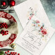 As flores brancas e vermelhas das aquarelas de inverno estão aninhadas em folhas e folhagem verdes de sábado macio. Flocos de neve Dourados adicionam um toque festivo. Uma escrita elegante, simples e moderna dá-lhe uma vibração aberta e arejada. Há também um boquete floral de inverno com um toque de flocos de neve ouro no verso.