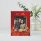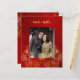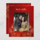Este elegante convite para o casamento chinês traz uma foto e, uma folha de ouro real, um símbolo de dupla felicidade de ouro e flores de folha de ouro em um fundo floral vermelho-rubi cinzento. Nomes de noiva e noivo em um elegante roteiro escrito à mão. Convite para casamento chinês ou convite para cerimônia de chá.