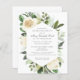 A celebração elegante de um convite à vida apresenta grandes flores brancas aninhadas em uma folhagem botânica moderna verde-sage. O nome da pessoa morta está escrito em um texto tradicional. Todo o texto pode ser facilmente editado para criar uma lembrança pessoal.