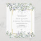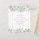 Greenery Watercolor Flóral Sage Lilac Orçamento convite para casamento com bonito sábio e folhas lilás que caem sobre um elegante quadro de ouro que envolve os detalhes do seu casamento em texto elegante clássico. O inverso tem o seu site de casamento e os detalhes do RSVP, e o código QR. Projetado por Thisnotme©