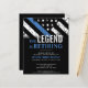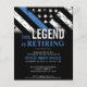 Este design apresenta uma bandeira da polícia com listras pretas e brancas, e uma fina faixa azul de linha também. O texto "A lenda está se aposentando" se senta acima de todos os detalhes partidários para os detalhes do polícia aposentado, xerife, capitão ou chefe do partido aposentado.