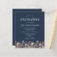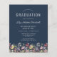Uma bela borda floral de aquarela de flores silvestres decora a borda inferior deste convite de festa de formatura de vassouras. Personalize o texto branco em um fundo azul marinho com o nome do formando em script de escrita manual; o ano escolar e de classe em sans serif; e os detalhes de data, local e RSVP em fonte serif. A parte traseira da placa é azul marinho estável.