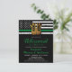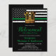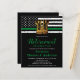 Convites à Reforma Militar da Linha Verde fina. Celebre anos de serviço dedicado, sua aposentadoria militar e convide amigos e familiares para o seu partido militar com esta bandeira verde fina russa com Dourado Convite à Reforma Militar do Exército. DESIGN americano na bandeira da Polícia, cores, branco verde-preto vestido e design de ouro. Este convite à reforma militar é também perfeito para a graduação militar, para o soldado que vai embora parte, para destacamentos e para o regresso a casa, para mudar de local na personalização. Veja nossa coleção para combinar presentes de aposentadoria militar, favoritos para festas militares de aposentadoria e suprimentos. COPYRIGHT © 2021 Judy Burrows, Black Dog Art - Todos Os Direitos Reservados. Convite de festas de aposentadoria de bandeira fina da linha verde militar