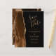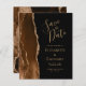 A borda esquerda deste elegante casamento moderno salve o cartão de data apresenta uma mocha marrom aqueteira agate borda com falsa brilho dourado. O texto personalizável combina manuscrito dourado, fontes em copperplate e itálico em um fundo preto. O verso apresenta um design de agate marrom e dourado.
