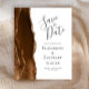 A borda esquerda deste elegante casamento moderno salve o cartão de data apresenta uma mocha marrom aqueteira agate borda com falsa brilho dourado. O texto personalizável combina a escrita manual de cinzas racoais, as fontes em copperplate e itálico em um fundo branco. O verso apresenta um design de agate marrom e dourado.