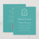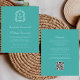 Este elegante design de convite de casamento inspirado em vintage apresenta um par de iniciais monográficas brancas em letra serif aberta acima e abaixo de uma linha divisória e rodeadas por uma crista botânica de arte em linha num fundo azul turquesa. O verso fornece espaço para detalhes do casamento em um fundo de turquesa sólido, junto com um código QR que os convidados podem digitalizar para visitar seu site e RSVP.