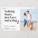 Deixe seu melhor cachorro anunciar seu casamento com este moderno e elegante cão de estimação "Nada de Rico, Apenas Amor, e Cachorro" guarde os cartões postais. Estes cartões postais de convite para casamento de orçamento precisam ser enviados como cartões postais de tamanho excessivo, de modo que podem incorrer em despesas de correio, mas não precisam de um envelope ou etiqueta de endereço de retorno. Personalize com sua foto favorita de noivado, foto de cão ou foto com o cachorro e personalize com nomes, data e local do casamento. Estes convites para casamentos de cães são uma obrigação para amantes de cães e mães de cães! COPYRIGHT © 2020 Judy Burrows, Black Dog Art - Todos Os Direitos Reservados. Orçamento Nada Rico Apenas Adora Cartões salve a data De Cachorro