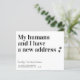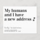 Meu Humano E Eu Temos Um Novo Endereço! Deixe o seu melhor amigo anunciar sua jogada com este cartão de anúncio giro e engraçado. Personalize os nomes do cão ou gato e o seu novo endereço. Esses cartões postais que movem o cão do orçamento precisam ser enviados como cartões postais de tamanho excessivo, de modo que podem incorrer em despesas de postagem padrão, mas eles não precisam de um envelope ou etiqueta de endereço de retorno. Este anúncio em movimento é um imperativo para todos os amantes de cães, amantes de gatos e quaisquer animais de estimação! COPYRIGHT © 2020 Judy Burrows, Black Dog Art - Todos Os Direitos Reservados. Orçamento Novo Endereço Pet Dog Movimentamos Cartão