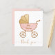 Obrigado seu chá de bebê convidados com esse obrigado bonito e econômico que você apresenta uma cor-de-rosa pastel e uma aquarela dourada de uma carruagem de bebê retrorada e "obrigado você" escrito em um roteiro de na moda que coordena com o ouro da carruagem. Na frente, você pode personalizar o texto na carruagem (nome do bebê, "Obrigado" ou deixar vazio); no verso, você pode personalizar facilmente seu obrigado, sua mensagem e assinatura.