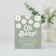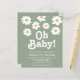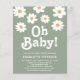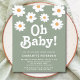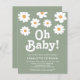 Você está planejando um chá de fraldas neutro em relação ao gênero? Este convite para chá de fraldas de margarida do orçamento é decorado com margaridas e tipografia de na moda retro em um fundo verde de sábio.