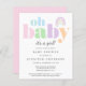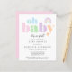 Este convite para a chá de uma bebê amiga do orçamento apresenta "oh baby" em uma tipografia moderna, azul, verde, rosa, roxo e laranja, um arco-íris abstrato e "é uma menina!" em um roteiro na moda.