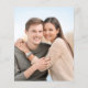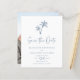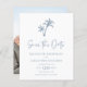 Este casamento com o orçamento, exceto o cartão de data, tem um simples design de praia tropical com dois palmeiras no topo, num esquema de cor azul branco e empoeirado, com um modelo de foto no verso.