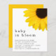 Girassol Amarelo Em Chá De Sangue Convidam. Um alternativo MENOR de 4,5" x 5,6", compatível com o orçamento. Disponível em um STOCK de PLACA SEMI GLOSS 110 lb ou um STOCK de PAPEL THINNER SATIN FINISH 80 lb. Os envelopes são um extra opcional. Sexo neutro. Um girassol gigante está no topo à direita e o cabeçalho é grande abaixo em na moda com os detalhes no fundo. Personalize facilmente o texto para seus próprios detalhes.