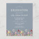 Uma bela borda floral de aquarela de flores silvestres decora a borda inferior deste convite de festa de formatura de vassouras. Personalize o texto branco em um fundo azul empoeirado com o nome do formando em script de escrita manual; o ano escolar e de classe em sans serif; e os detalhes de data, local e RSVP em fontes serif. A parte de trás do cartão apresenta um padrão de coordenação de flores silvestres num fundo azul empoeirado.
