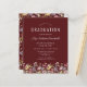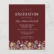 Uma bela borda floral de aquarela de flores silvestres decora a borda inferior deste convite de festa de formatura de vassouras. Personalize o texto branco em um fundo vermelho burgundy com o nome do formando em script de escrita manual; o ano escolar e de aula em sans serif; e os detalhes de data, local e RSVP em serif. A parte de trás da carta apresenta um padrão coordenado de flores silvestres em fundo burgundy.