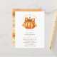 Um pouco de abóbora está a caminho do chá de fraldas de outono Convite com uma abóbora fofa com arco de laranja para bebês na estação de outono