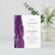 A borda esquerda deste convite de casamento moderno e elegante apresenta uma borda de ágata em aquarela roxa aparada com brilho prateado falso. O texto personalizável combina fontes script cinza carvão e sem serifa em um fundo branco. O verso fornece espaço para detalhes do casamento em um fundo branco sólido, juntamente com um código QR que os convidados podem digitalizar para visitar seu site e responder, o que economiza o custo de impressão e envio de cartões de resposta separados.