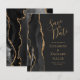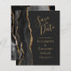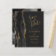 A borda esquerda deste elegante casamento moderno salve o cartão de data apresenta uma borda de agata preta aparada com falso brilho dourado. O texto personalizável combina manuscrito dourado, fontes em copperplate e itálico em um fundo fora de preto. O verso apresenta um design de agate preto e dourado correspondente.