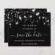 Um cartão de salvar a data feminino e moderno para uma festa de aniversário de 40 anos (ou qualquer idade). Um fundo preto elegante decorado com estrelas prateadas falsas. Personalize e adicione uma data e nome/idade 40. O texto: Salve a data é escrito com um estilo de letra manuscrita grande e moderno.