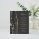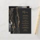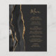 A borda esquerda deste elegante cardápio de casamento moderno apresenta uma borda de ágata em aquarela preta aparada com brilho falso dourado. O texto personalizável combina fontes de escrita à mão em cor dourada e fontes copperplate em um fundo preto claro. O lado reverso apresenta um design de ágata preto e dourado correspondente.