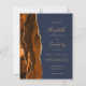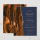 A borda esquerda deste elegante convite de casamento moderno apresenta uma cor de água laranja queimada, aparada com falsa brilho dourado. O texto personalizável combina manuscrito dourado, fontes em copperplate e itálico em um fundo azul marinho escuro. O verso apresenta uma design de cor laranja queimada e dourada.