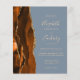 A borda esquerda deste elegante convite de casamento moderno apresenta uma cor de água laranja queimada, aparada com falsa brilho dourado. O texto personalizável combina manuscrito pálido e dourado, fontes copperplate e itálico em um fundo azul empoeirado. O verso apresenta uma design de cor laranja queimada e dourada.