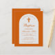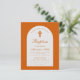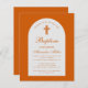 Um convite batismo para o batizado de uma menina. Numa cor moderna. laranja queimada, tem um arco branco com dentro de texto laranja. A palavra Batismo e o nome são escritos num guião caligráfico elegante; a primeira linha é o texto arquivado.