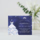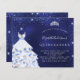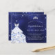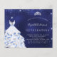 Um convite moderno, na moda e glamouroso para uma Quinceañera, festa de aniversário 15. Um fundo azul da meia-noite com poeira falsa, uma tiara e um vestido. A cor azul é irregular. O nome é escrito com um moderno estilo escrito à mão. Personalize e adicione os detalhes da sua festa.