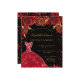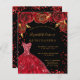 Um convite moderno, na moda e glamouroso para uma Quinceañera, festa de aniversário 15. Um fundo preto com brilhos, um vestido vermelho e rosas vermelhas, florais. O nome é escrito com um moderno estilo escrito à mão. Personalize e adicione os detalhes da sua festa.