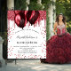 Para uma elegante Quinceañera, 15. Um fundo branco na moda. Decorado com brilho vermelho e balões. Personalize e adicione um nome, idade e detalhes da festa. O nome é escrito com um script de estilo manuscrito