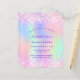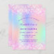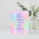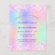 Uma Quinceañera feminina e feminina, convite de aniversário 15. Na frente: Um arco-íris, fundo holográfico colorido em roxo, rosa, verde-menta, ouro-rosa. Decorado com brilho pinto-claro, brilhos. Personalize e adicione um nome e detalhes da parte. O nome é escrito com um script de estilo manuscrito, letras cor roxa.