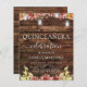 Budget Rustic Country Outdoor on Dark Wood with Burgundy, Orange and Yellow Sunflower with Mason Jars on String Light Autumn ou Fall Quinceanera Celebration - inclui bela e elegante tipografia de roteiro para a Celebração Especial de Aniversário.