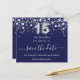 Uma garota e moda Salve o cartão de data para uma Quinceañera, 15 festa de aniversário. Um fundo azul marinho colorido. Decorado com estrelas de falso prata. O texto: Salvar a Data é gravado com um script de estilo com letra de tendência grande. O número 15 é escrito com uma fonte no estilo do balão.