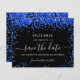 Um fundo preto decorado com confete azul real. Personalize e adicione uma data e nome/idade. O texto: Salvar a Data é gravado com um script de estilo com letra de tendência grande.