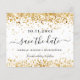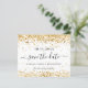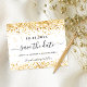 Uma garota e moda Salve o cartão de data para uma Quinceañera, 15 festa de aniversário. Um fundo branco de na moda, decorado com poeira falsa dourada. Personalize e adicione uma data, nome e texto. O texto: Salvar a Data é gravado com um script de estilo com letra de tendência grande com alternâncias.
