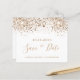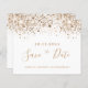 Uma garota e moda Salve o cartão de data para uma Quinceañera, 15 festa de aniversário. Um fundo branco de na moda, decorado com poeira falsa dourada. Personalize e adicione uma data, nome e texto. Letras coloridas com ouro. O texto: Salvar a Data é gravado com um script de estilo com letra de tendência grande.