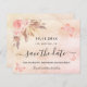 Uma garota e moda Salve o cartão de data para uma Quinceañera, 15 festa de aniversário. Um fundo cor-de-rosa pincelado, rosa, gradiente dourado, decorado com florais cor-de-rosa pincelado, grama pampas e borboletas. Personalize e adicione uma data e nome/idade. O texto: Salvar a Data é gravado com um script de estilo com letra de tendência grande.